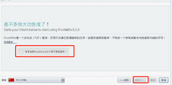5、弹出协议界面,勾选“我不会将FrostWire用于....”,然后点击【前进】即可完成FrostWire的安装。