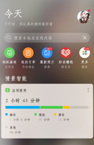 1、打开华为手机,左滑屏幕至搜索页面,如图,点击右上角的头像。