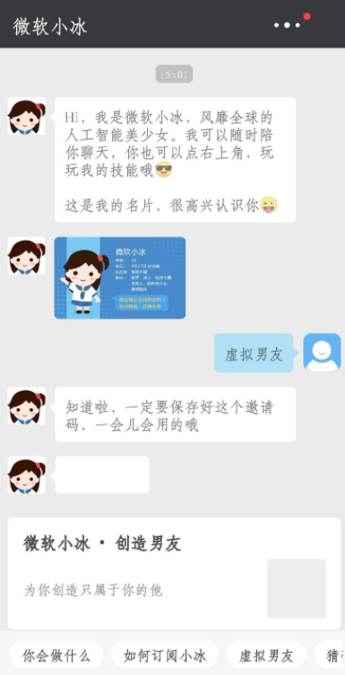 5、进入聊天窗口,输入并发送【虚拟男友】,获得邀请码,