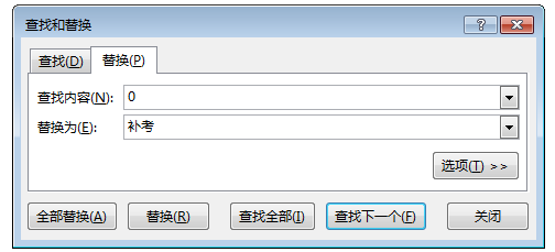 2、按照一般的情形,我们使用快捷键【Ctrl + H】,调出【查找和替换】窗口,在“查找内容”后输入“0”,“替换为”后输入“补考”,然后点击【全部替换】。