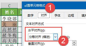 如果确实需要进行单元格字符对齐的话,最好选中目标单元格区域,然后打开“设置单元格格式”窗口,选择【对齐】-【分散对齐】。