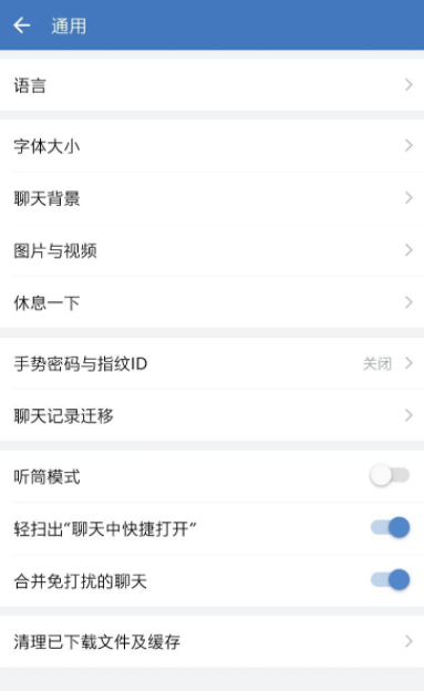 进入通用界面,如图,点击下方的【清理已下载文件及缓存】,查看需要清理的文件,这里选择【聊天中的文件】,