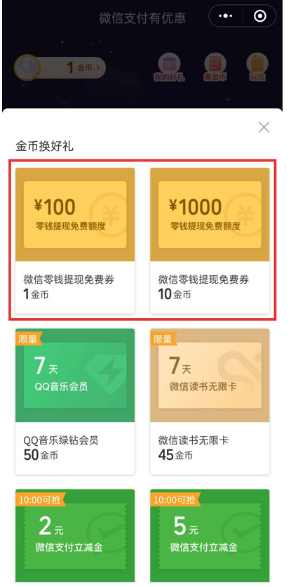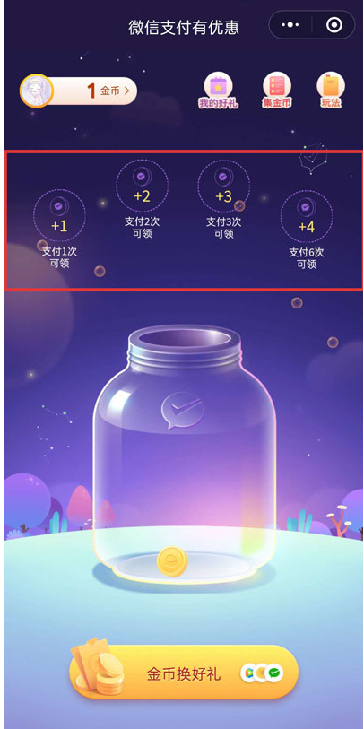 进入微信支付优惠页面,如图,想要获得金币需要先完成支付任务,点击【金币兑换好礼】按钮,