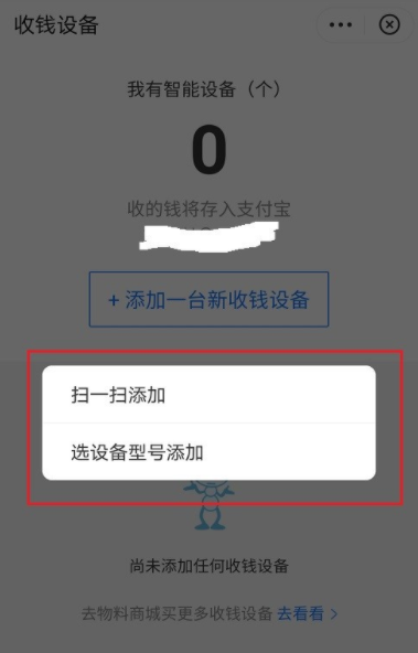 弹出窗口,如图,你可以点击扫一扫添加,也可以选择设备型号添加,添加之后,支付宝即可成功绑定收款音箱。