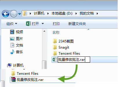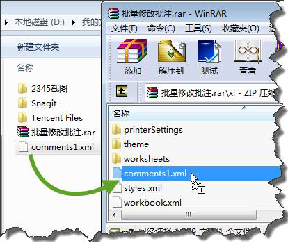 4、将做过替换修改的【comments1.xml】文件拖动到原压缩文件中替换更新。