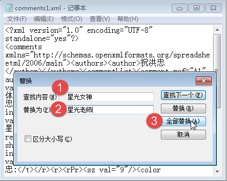 3、右击【comments1.xml】文件,用“记事本”打开方式打开该文件;然后点击【编辑】-【替换】(或者直接使用快捷键Ctrl+H)打开替换窗口,将查找内容设为“星光女神”,替换设置为“星光老师”,接着点击【全部替换】,最后保存即可。