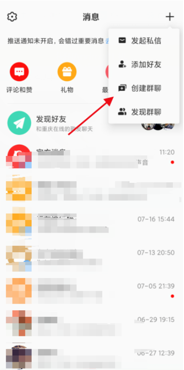 在手机中打开全民K歌软件,进入界面,点击下方的【消息】,然后点击右上角的【+】,