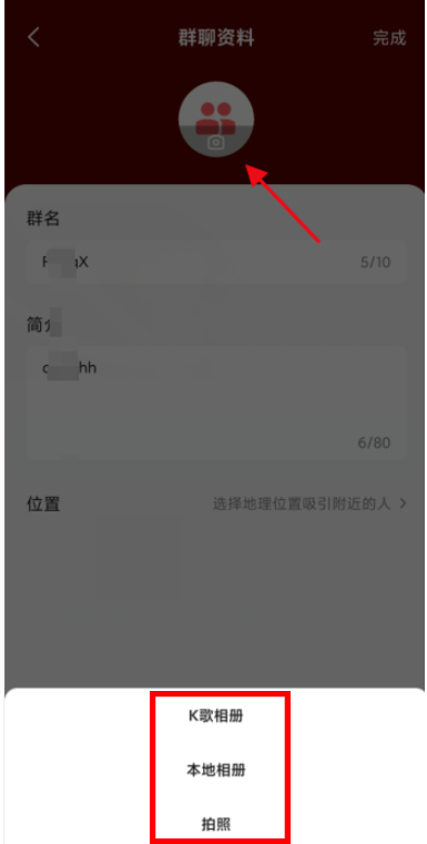 点击上方头像,选择添加头像的方式,包括【K歌相册】、【本地相册】、【拍照】等方式,