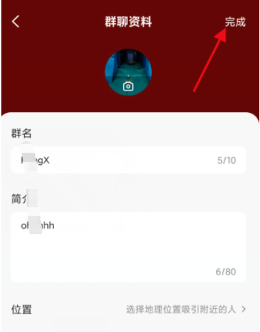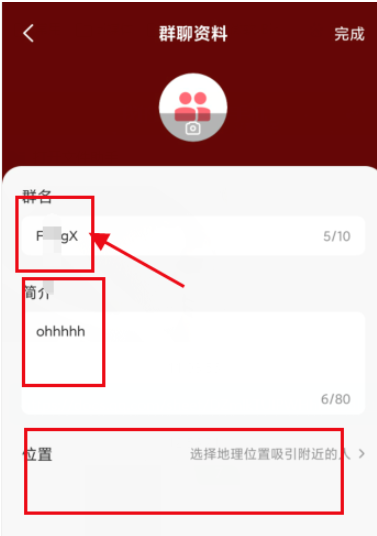 进入以下界面,如图,点击输入群名、简介和位置,设置群聊资料,