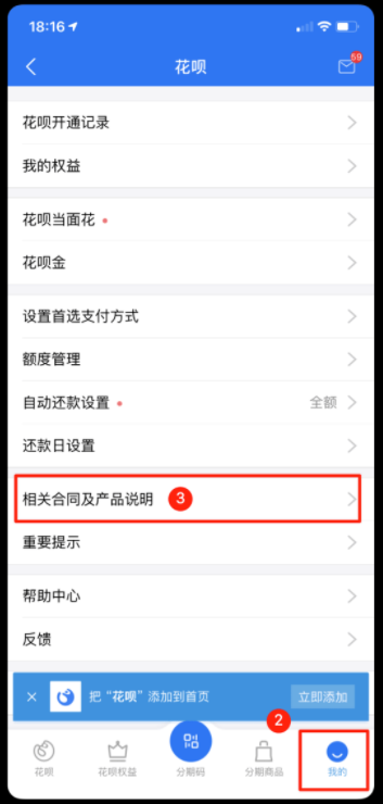打开花呗,点击右下角【我的】,找到【相关合同及产品说明】,点击查看,