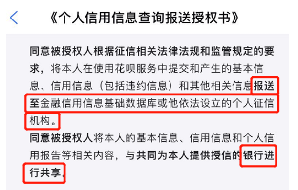 如图,合同中出现了【个人信用信息查询报送授权书】,那就说明你的花呗已经接入征信了,