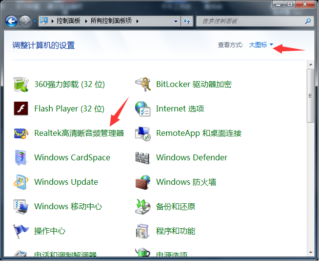 2、弹出电脑系统控制面板窗口,将查看方式设置为【大图标】,然后点击【音频管理器】如图。