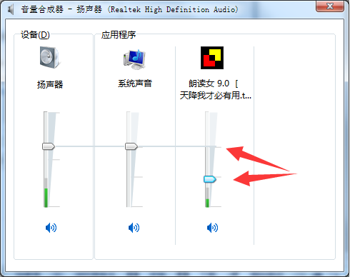 2、弹出音量合成器窗口,将朗读女的音量调整至与系统音量同一水平线即可。