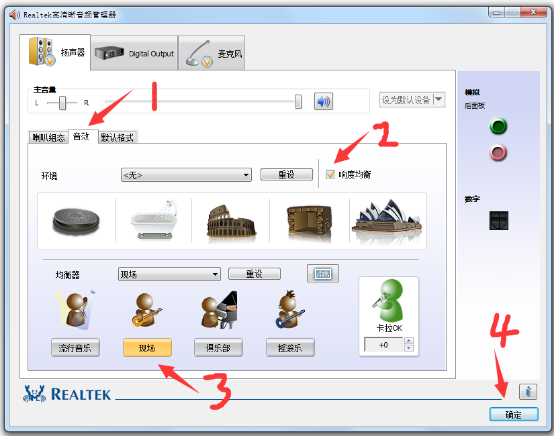 3、弹出音频管理器窗口,选择【扬声器】标签页,然后选择【音效】,之后勾选【响度均衡】,接着在均衡器一栏中点击【现场】,最后点击【确定】即可。