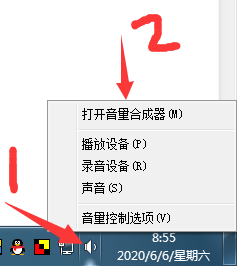 1、有些时候朗读女音量小是因为被设置了音量限制,右击桌面右下角小喇叭图标,在上拉菜单中点击【打开音量合成器】。