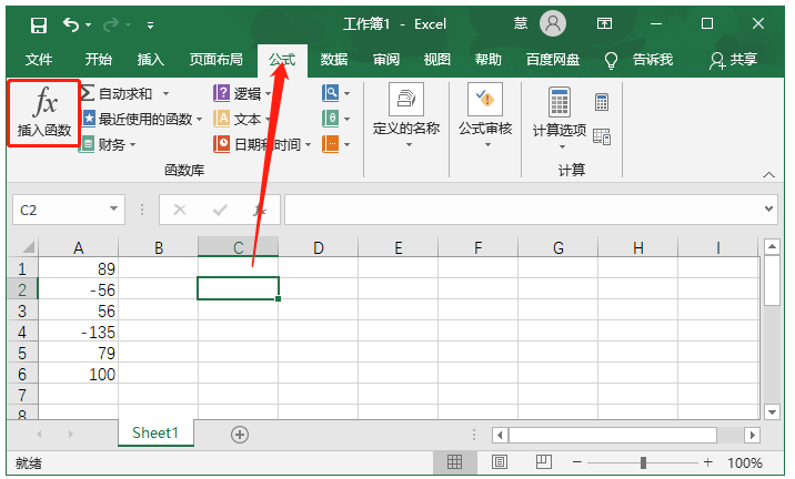 1、打开一个Excel表格,如图,首先选中一个空白单元格(负数改为正数后出现的单元格位置),在菜单栏点击【公式】——【插入函数】 ,
