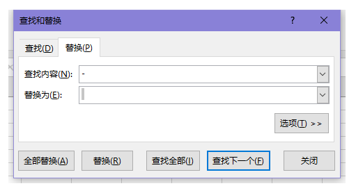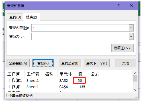 6、选中负数所在的行或者列,使用快捷键【Ctrl+F】打开查找和替换窗口,切换到【替换】,输入查找内容为【-】(负数符号),替换内容输入一个空格,点击【查找全部】,