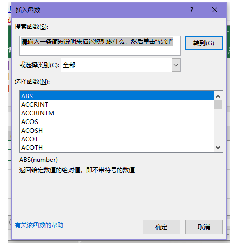 2、弹出窗口,将【选择类别】改为【全部】,然后选择函数【ABS】,点击确定,
