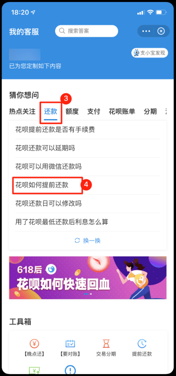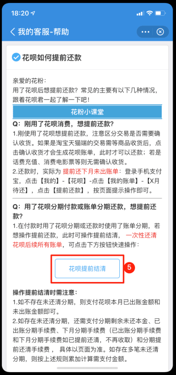 2、如图,点击【 还款】一栏,选择【 花呗如何提前还款】,进入服务窗口,点击【 花呗提前结清】, 将你的账单全部还清,