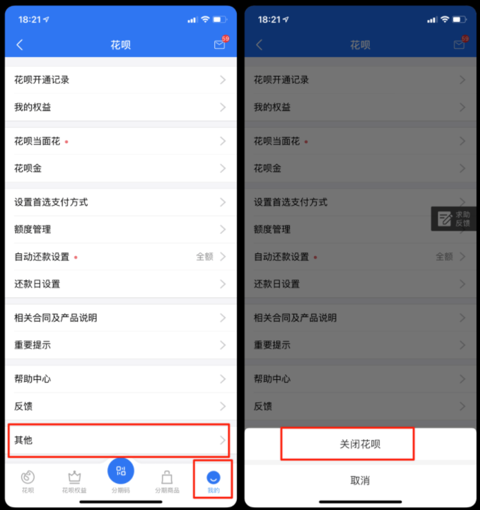 重新回到花呗服务,点击【我的】——【其他】,选择【关闭花呗】,