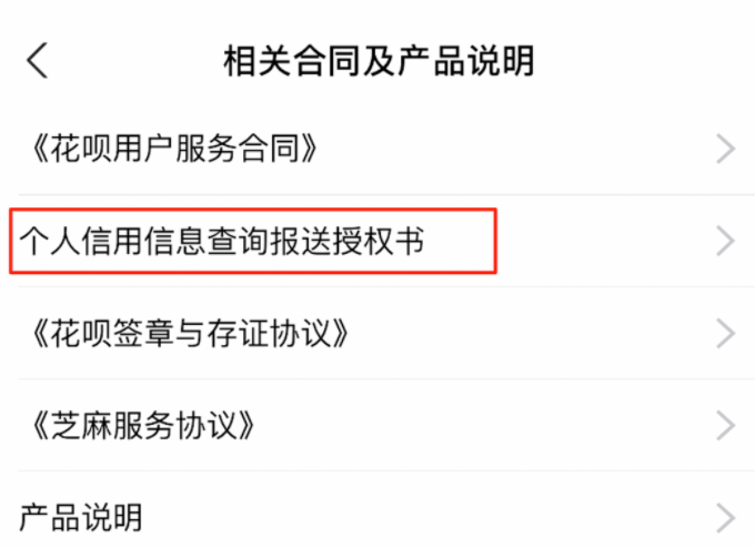 3、再一次开通花呗,重新开通之后,《相关合同及产品说明》中就不会出现征信授权了 ,征信报告中也不会有花呗的记录。