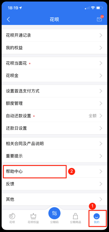 1、打开手机支付宝,进入首页,点击下方【我的】,选择【花呗】服务,进入花呗页面,点击【我的】——【帮助中心】,