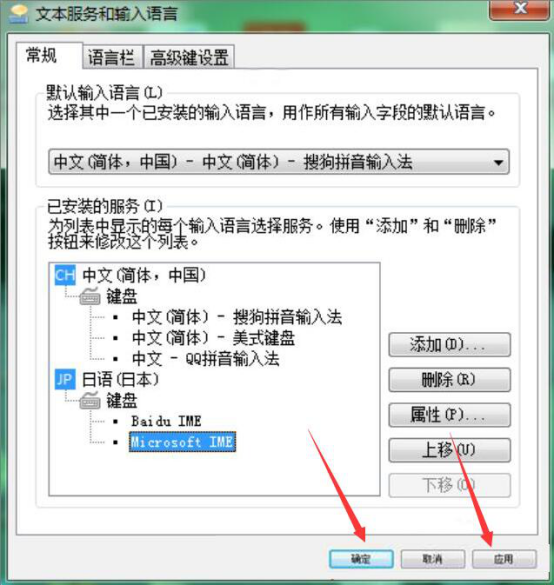 6.再回到“常规”选项卡,可以看到键盘中已经成功添加了百度IME日语输入法和Microsoft IME。我们点击“应用”按钮后再点击“确定”按钮。