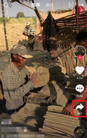 打开抖音APP,进入界面,找到相关视频进行播放,然后点击右侧的【转发】按钮,