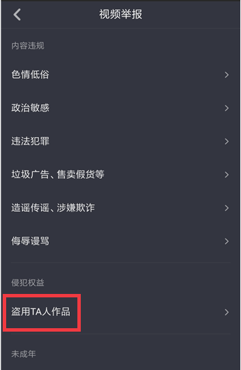 进入视频举报窗口,其中有一个类别就是【盗用TA人作品】,点击这个选项,