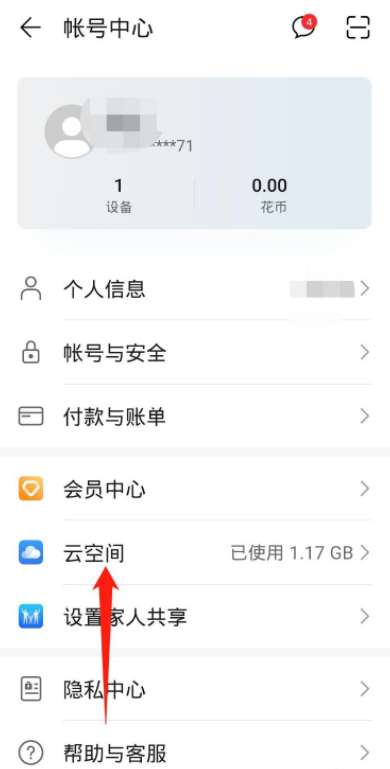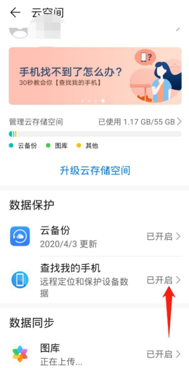 进入账号中心,点击【云空间】,打开云空间,如图,确保已开启【查找我的手机】功能,