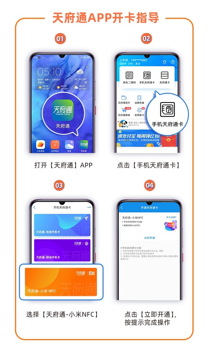 以上内容都确认无误后,打开天府通 App,按照下面的步骤进行开卡,就能使用天府通 - 小米 NFC乘坐公交地铁了。