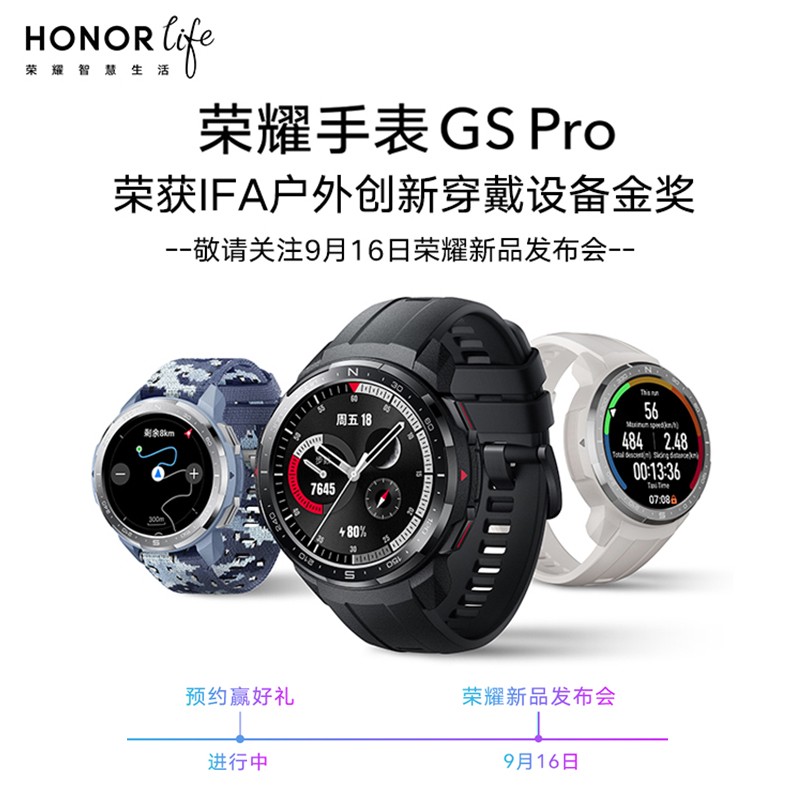 荣耀手表 GS Pro 重 45.5 克,支持 5 ATM 级防水,拥有 25 天超长续航(GPS 开启 48 小时),支持登山、滑雪等 100 多种专业户外模式,并荣获此次 IFA 户外创新穿戴设备金奖。