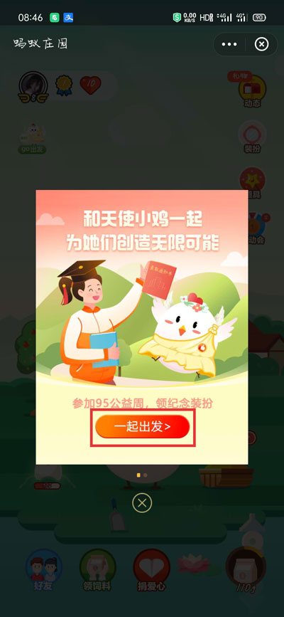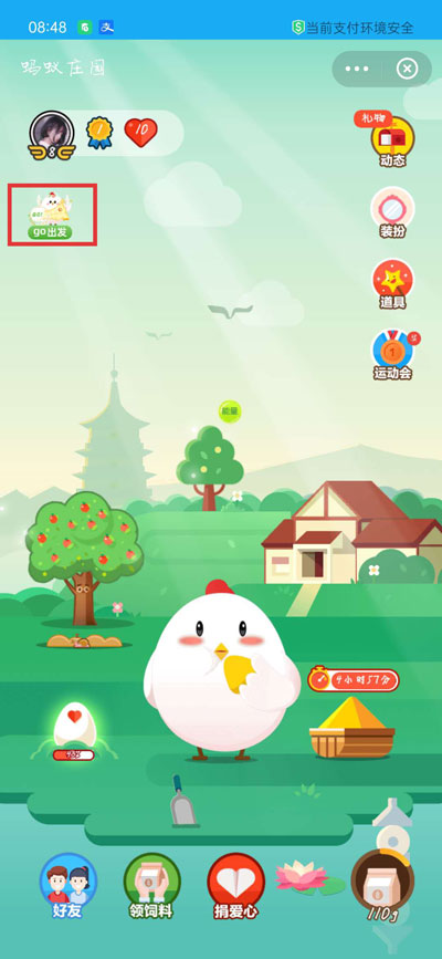 2、在蚂蚁庄园,可以看到我们的小鸡情况,点击左上角的【go出发】参与95公益周;