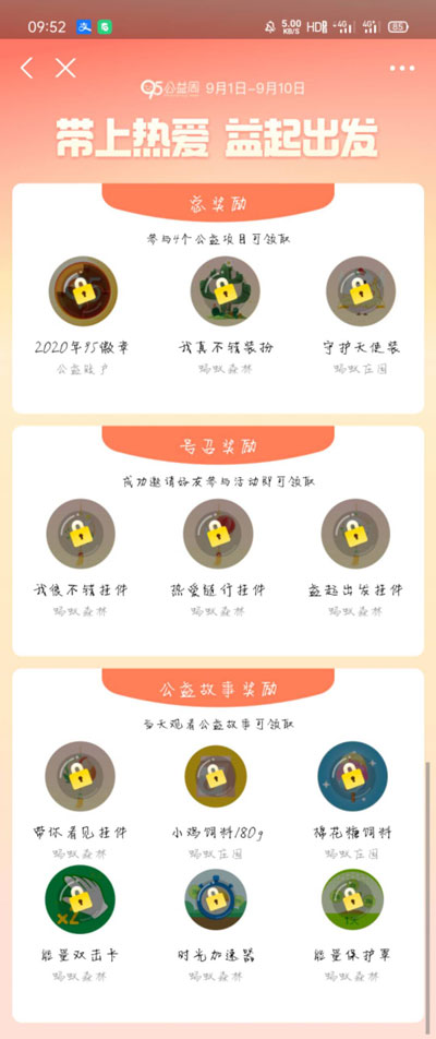 9、集齐4个徽章后,可以领取对应的奖励,这些奖励包括公益账户徽章和蚂蚁森林/蚂蚁庄园的装扮、挂件、饲料、道具等等;