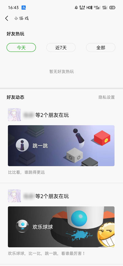 3、进入微信小游戏之后,可以看到好友动态,好友动态显示了所有好友在玩的小程序,以及玩的微信好友数量;