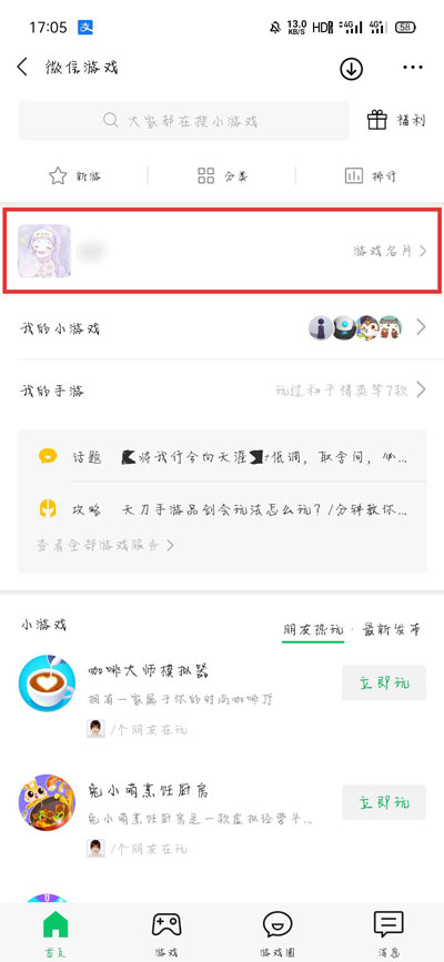 2、进入微信游戏页面后,点击上方的【游戏名片】进入下一步;