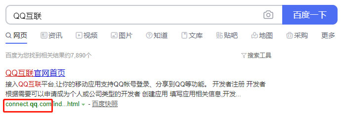 6、如果需要在电脑上查看,打开浏览器,搜索【QQ互联】,点击搜索结果中的官网进入:https://connect.qq.com/index.html;