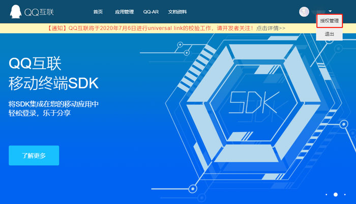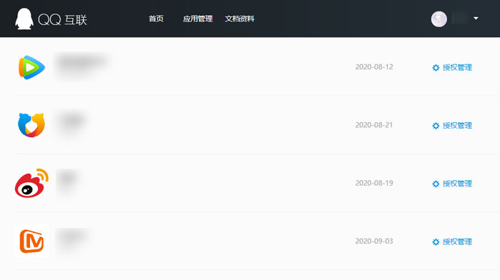 7、点击右上角的【登录】登录自己的QQ账号,然后点击右上角的【个人头像】,选择【授权管理】;