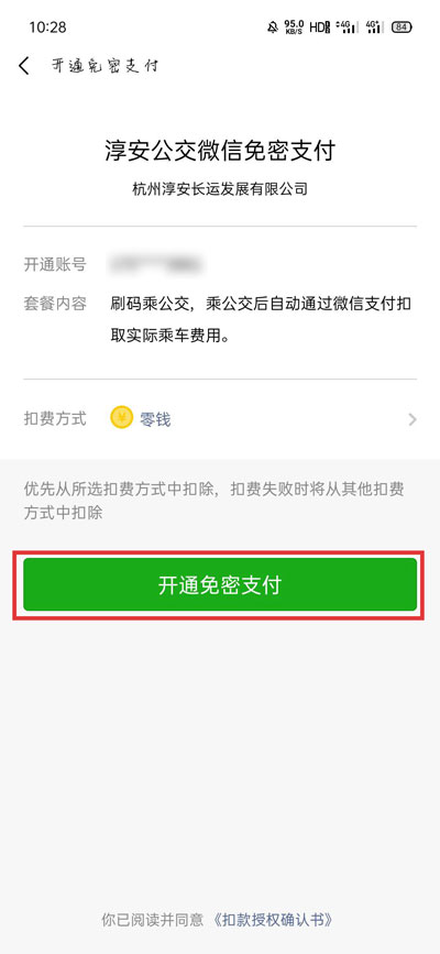 7、按照提示获取个人头像和手机号码权限,进入开通免密支付页面,点击【开通免密支付】;
