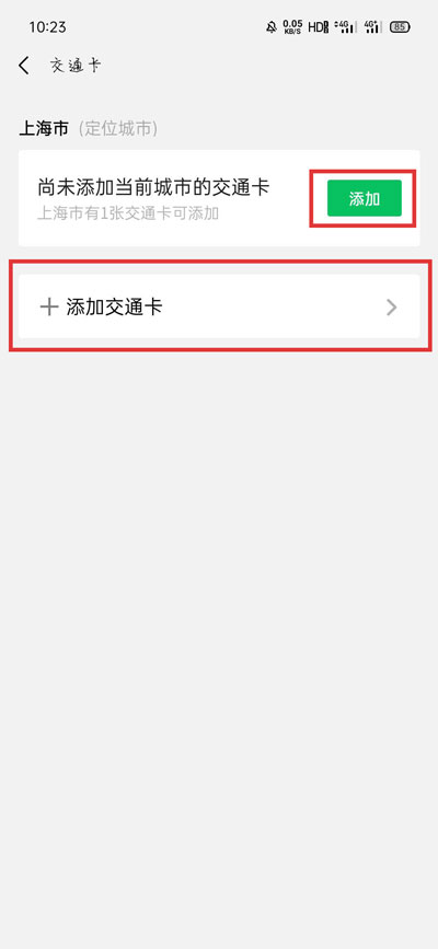 4、在交通卡卡包页面,会显示当前定位城市的交通卡,点击【添加】;