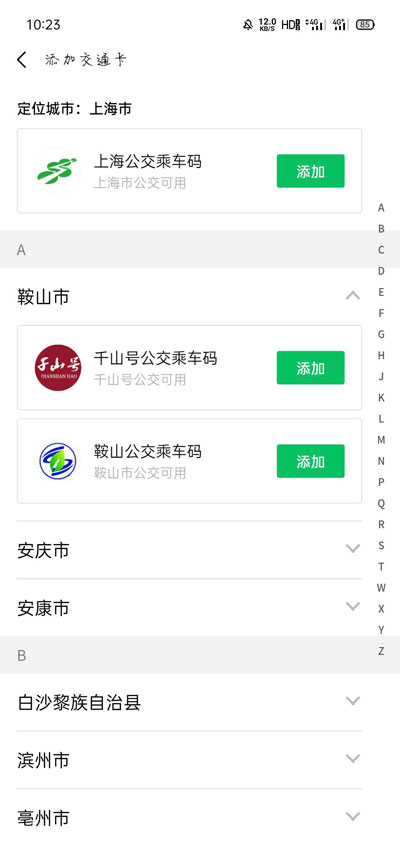 5、也可以选择【添加交通卡】然后选择需要添加的公交卡城市,展开后点击【添加】;
