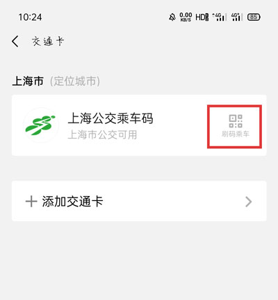 9、也可以在交通卡卡包页面,选择右侧的【刷码乘车】查看该公交卡的乘车码;