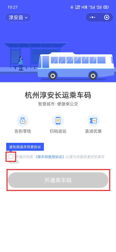 6、接着我们需要开通选择的城市交通卡,勾选【开通并同意……】,点击【开通乘车码】;