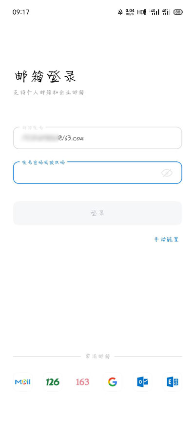 7、打开oppo手机邮箱,输入163邮箱账号,在密码行输入授权密码,点击【登录】;