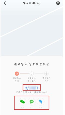 如图,家人地图创建成功,出现密码,将密码分享给亲友,让他们加入家人地图,最多可以加入12位家人,