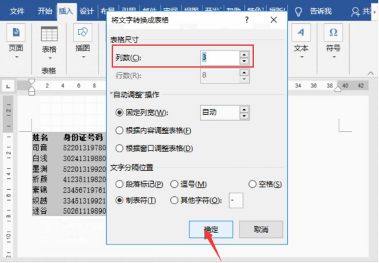 2.此时,word会弹出“将文字转换成表格”窗口,设置3列,再点击“确定”按钮。