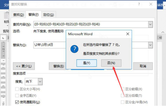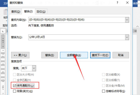 4.接下来,快捷键“Ctrl+H”打开“查找和替换”窗口。在“查找内容”中输入“([0-9]{6})([0-9]{4})([0-9]{2})([0-9]{2})([0-9]{4})”;而在“替换为”中则输入“\\2年\\3月\\4日”,并勾选“使用通配符”,再点击“全部替换”按钮。