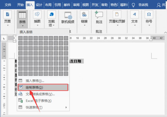 1.在word中,先全选需要提取身份证出生年月日的所有员工信息,再点击“插入”菜单栏中的“表格”,从并其下拉菜单中点击“绘制表格”。