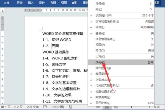 2.将“改写”状态勾选,在状态栏中,便可以看到出现了“改写”的状态,如下图所示。