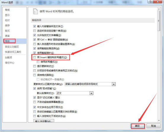 6.最后,在word选项窗口中,切换至“高级”页面,取消勾选“用Insert键控制改写模式”,再点击“确定”按钮,这样,同样能解决word打字后面的字消失的问题。